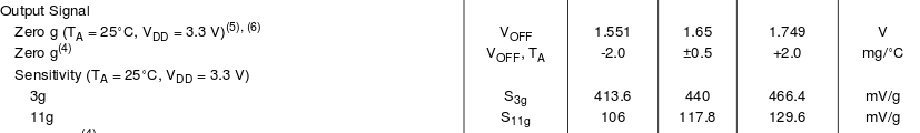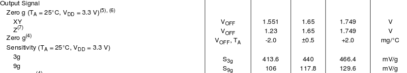 Below you can see voltage output for mma73x1. Please note there is three numbers for each value: For mma7341LC 0g is 1.65V. But due to component variations it can be in have any value between 1.551V and 1.749V. So you have to do calibration. The values are stable and will normally not changes during operations.